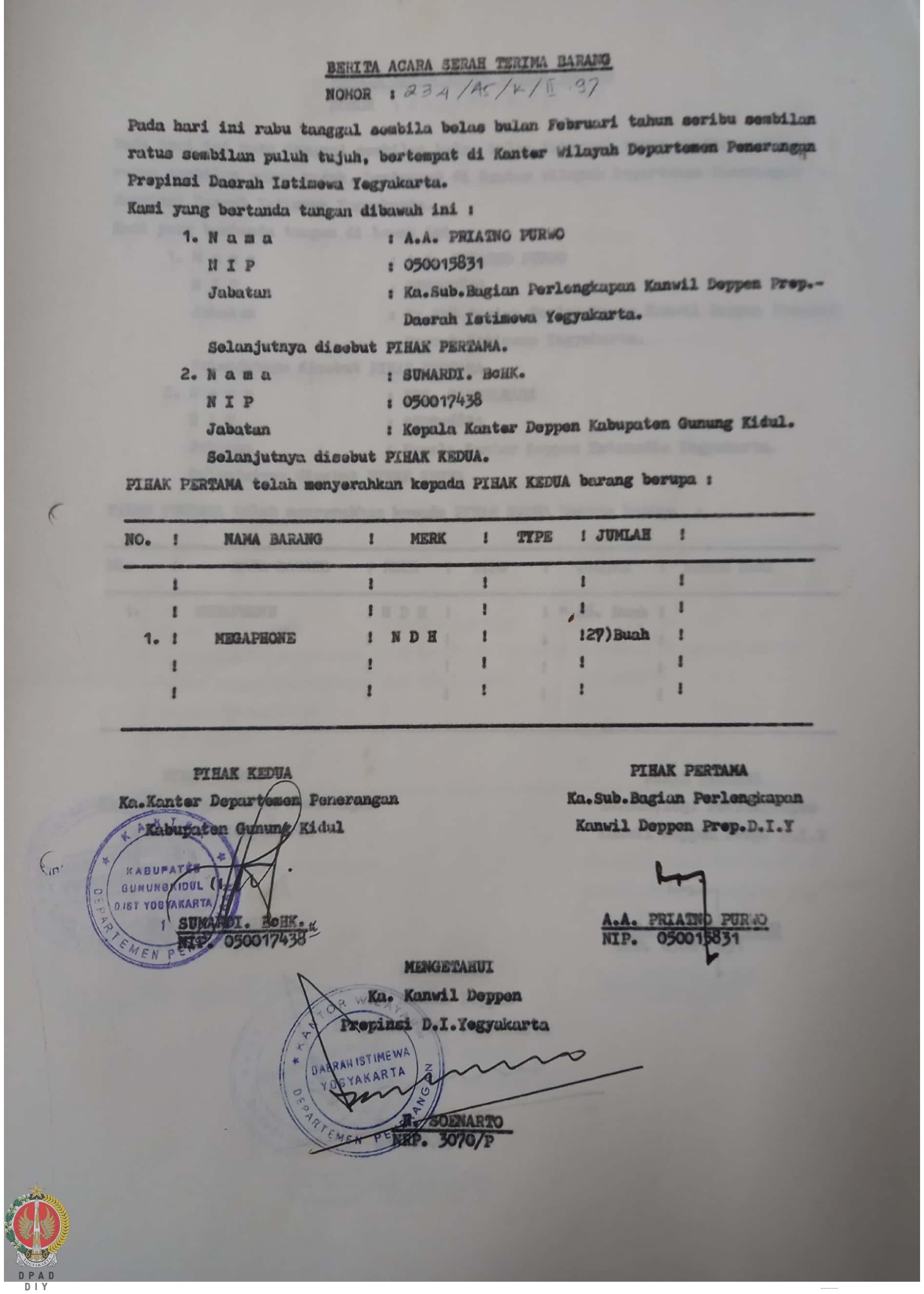 Bendel Berita Acara Serah Terima Barang dari Kepala Sub Bagian Perlengkapan Kantor Wilayah Departemen Penerangan Provinsi Daerah Istimewa Yogyakarta kepada Kepala Kantor Departemen Penerangan Kabupaten se-Yogyakarta