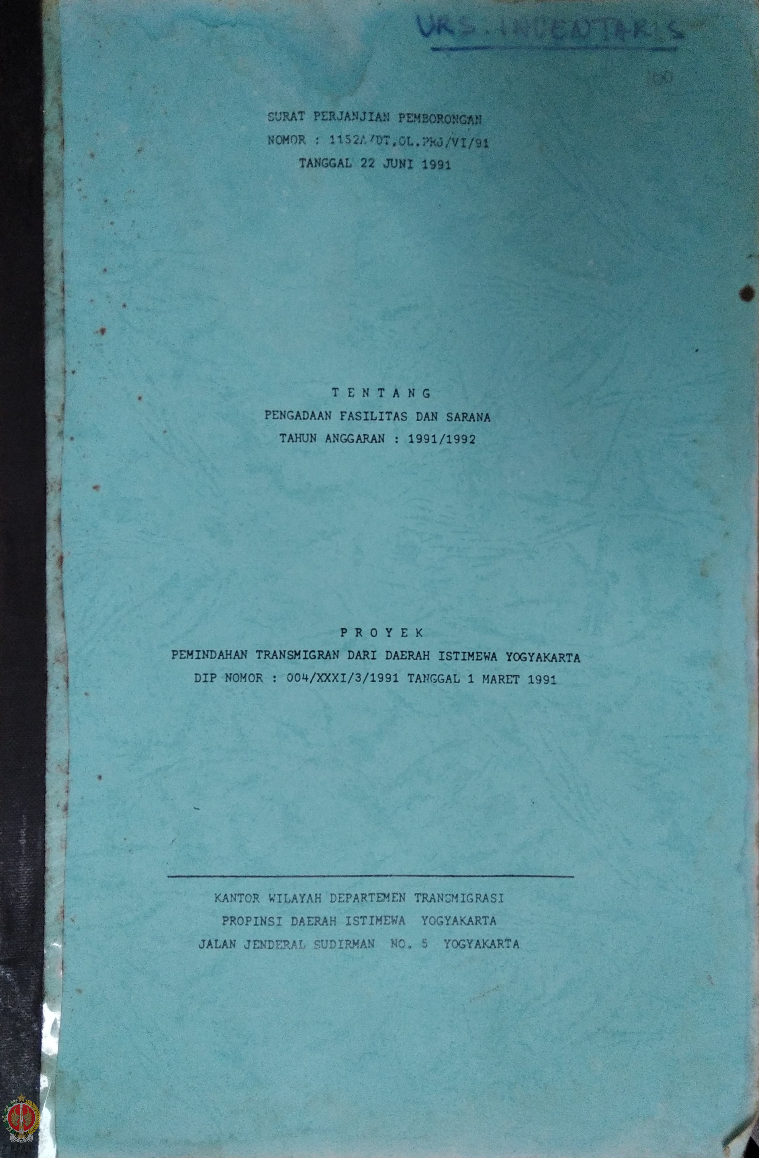 Surat perjanjian pemborongan antara Pemimpin Proyek Pemindahan Transmigran dari Daerah Istimewa Yogyakarta Kantor Wilayah Departemen Transmigrasi Provinsi Daerah Istimewa Yogyakarta dengan PB. Wahyu Murni dalam pekerjaan pengadaan fasilitas dan sarana Tahun Anggaran 1991/1992 proyek pemindahan transmigran dari Daerah Istimewa Yogyakarta beserta lampiran.