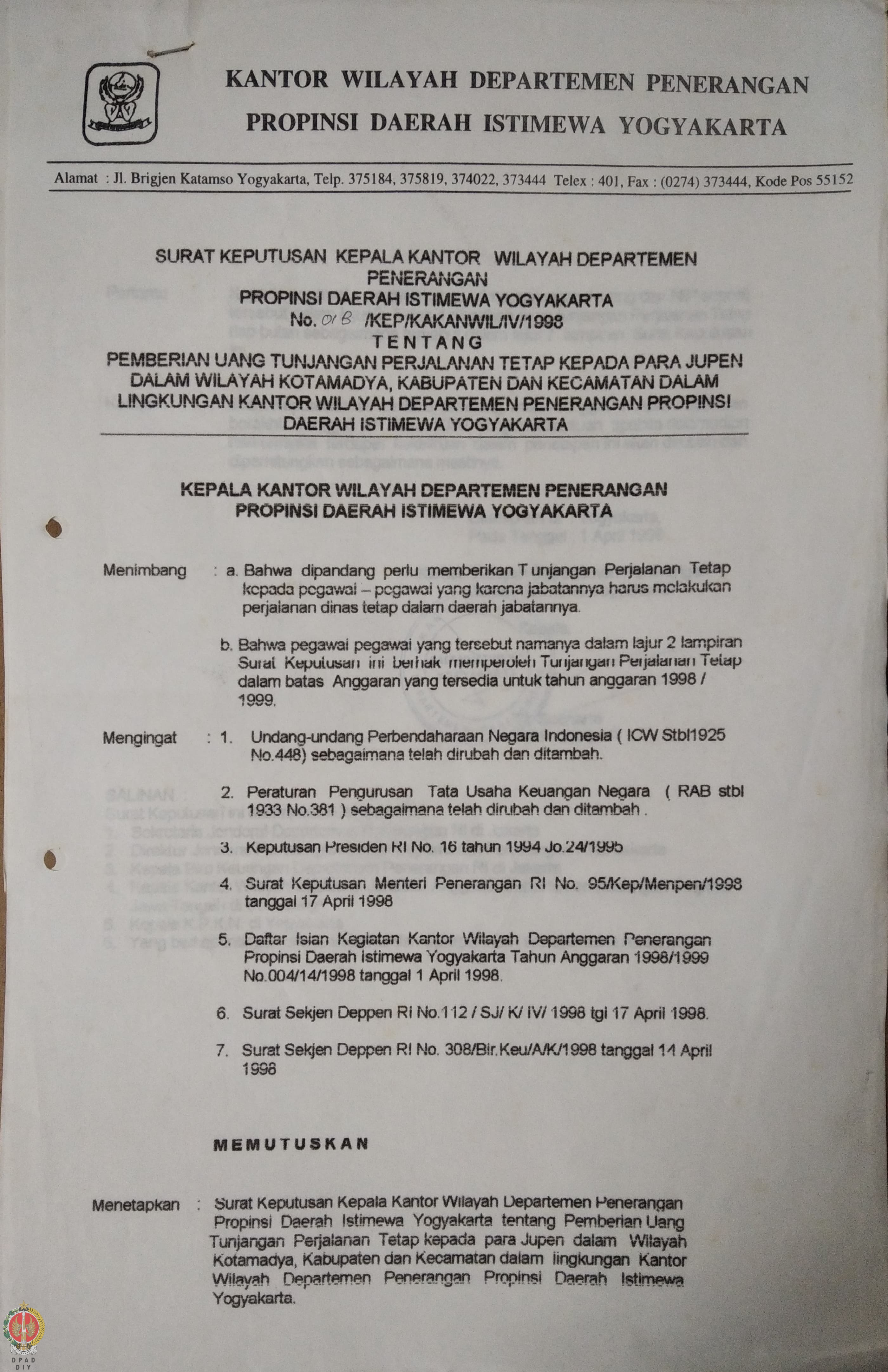 Surat Keputusan Kepala Kantor Wilayah Departemen Penerangan Daerah Istimewa Yogyakarta Nomor : 01B/KEP/Kakanwil/IV/1998 tentang Pemberian Uang Tunjangan Perjalanan Tetap kepada para Jupen dalam Wilayah Kotamadya, Kabupaten dan Kecamatan dalam lingkungan Kantor Wilayah Departemen Penerangan Daerah Istimewa Yogyakarta, beserta lampiran
