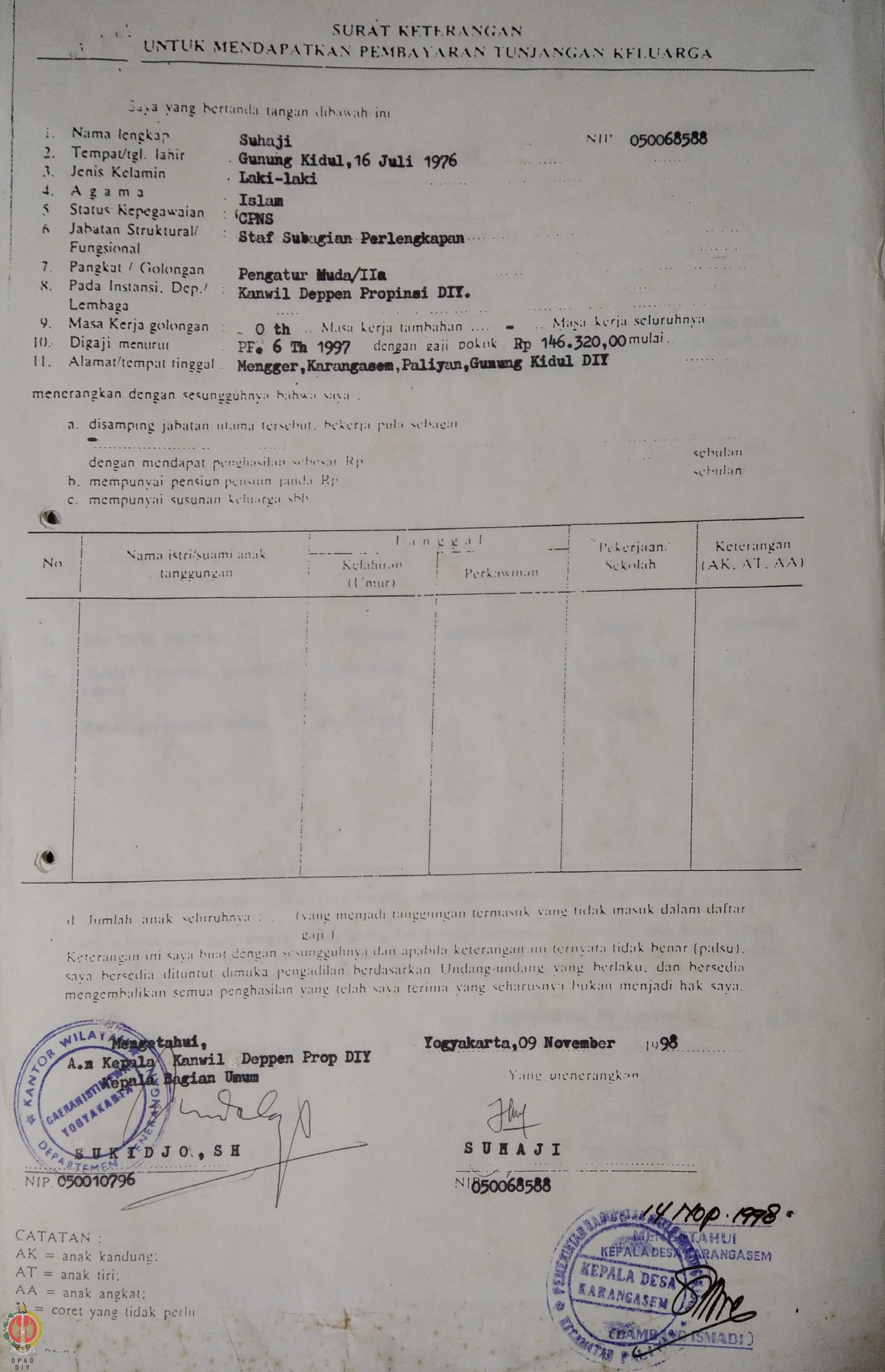 Bendel Surat Keterangan untuk mendapatkan Pembayaran Tunjangan Keluarga a.n. Suhaji dkk, beserta lampiran