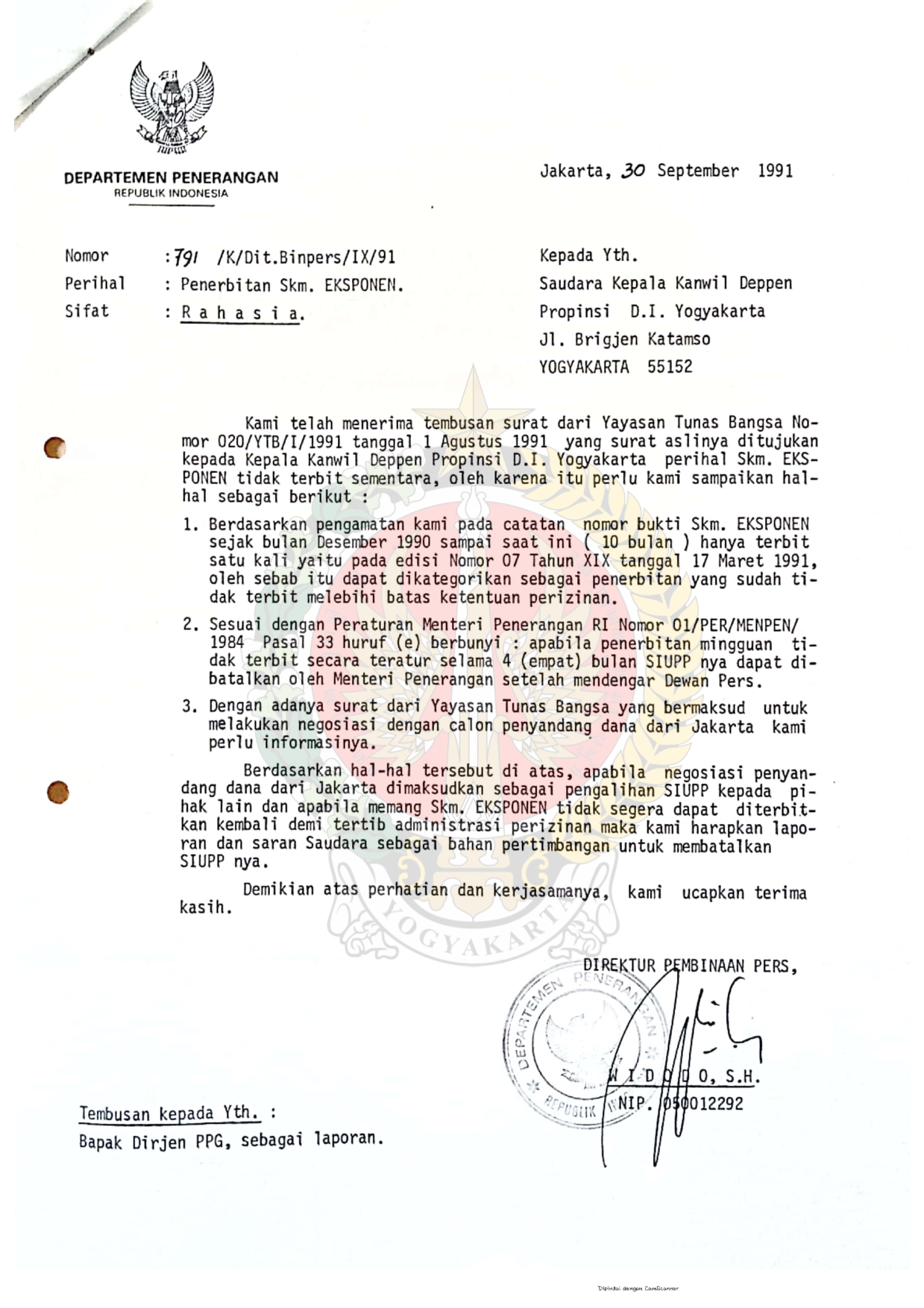 Berkas surat perihal pemberhentian sementara penerbitan Surat Kabar Harian Yogya Post, beserta lampiran.