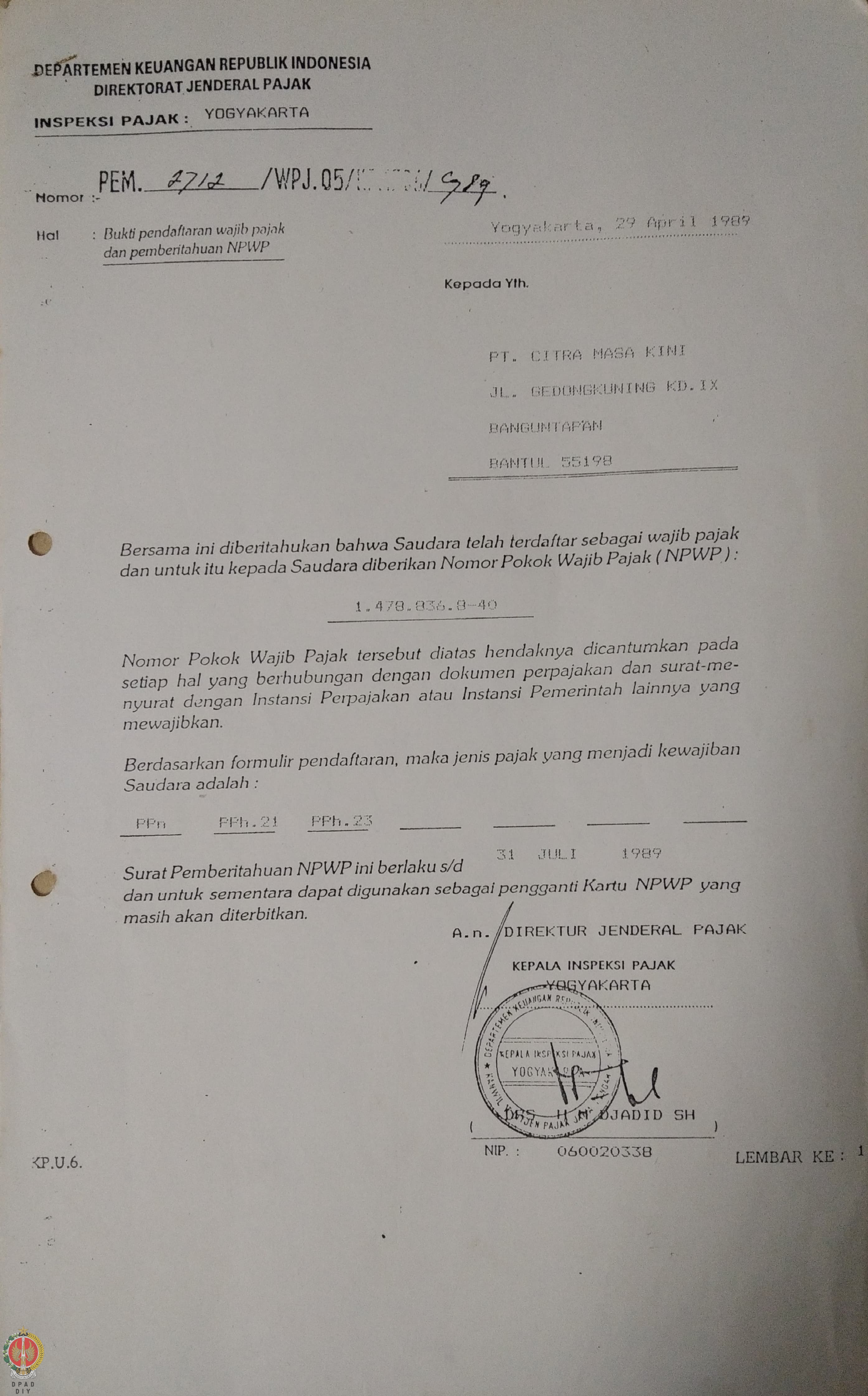Surat dari Departemen Keuangan Republik Indonesia Kepala Inspeksi Pajak Yogyakarta kepada PT Citra Masa Kini perihal bukti pendaftaran wajib pajak dan pemberitahuan Nomor Pokok Wajib Pajak (NPWP) 1.478.836.8-40 dengan kewajiban PPn, PPh 21, PPh 23.