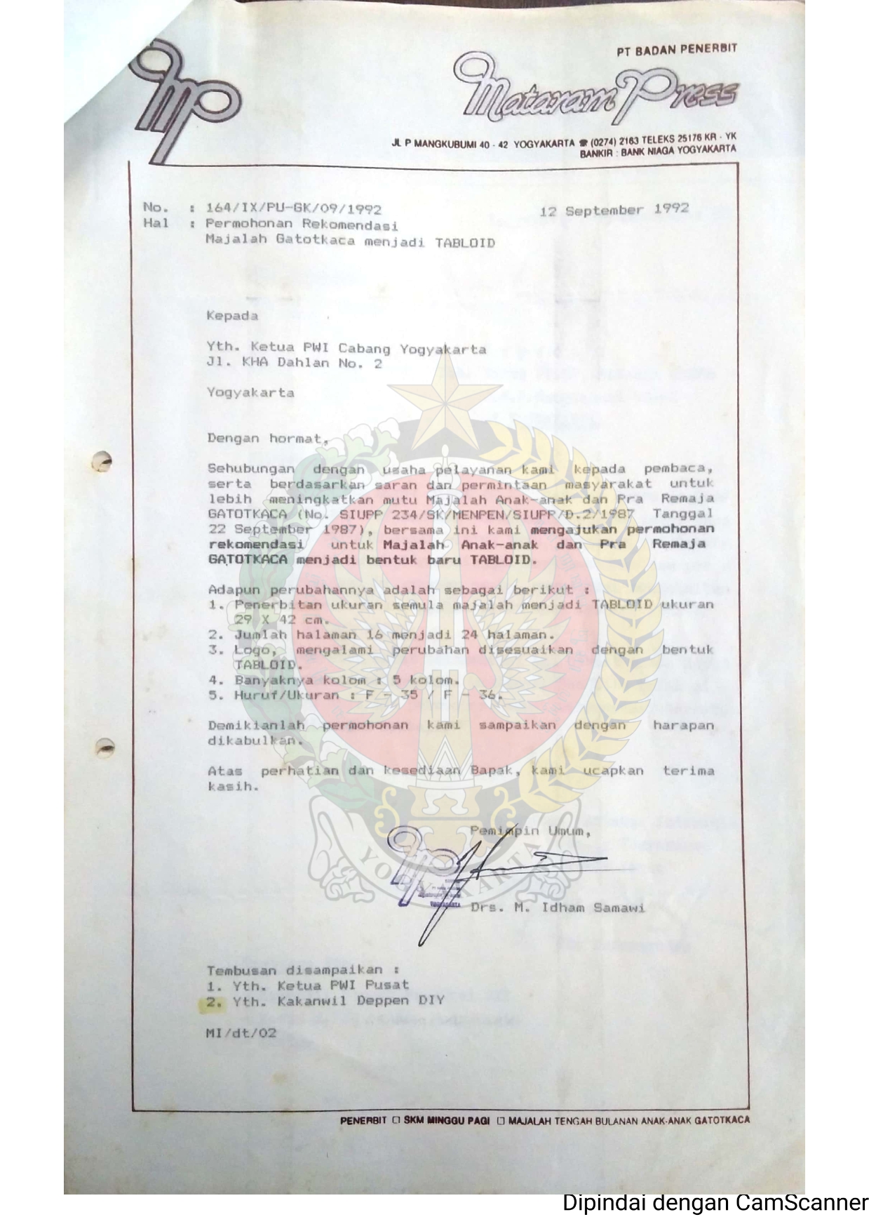 Berkas permohonan perubahan Majalah Gatotkaca menjadi Tabloid disertai dengan Surat Keputusan Nomor : 030/IX/DIRUT/10/92 tentang perubahan ukuran penerbitan Majalah Tengah Bulanan Gatotkaca menjadi Tabloid โjumlah halaman- banyaknya kolom dan Logo.