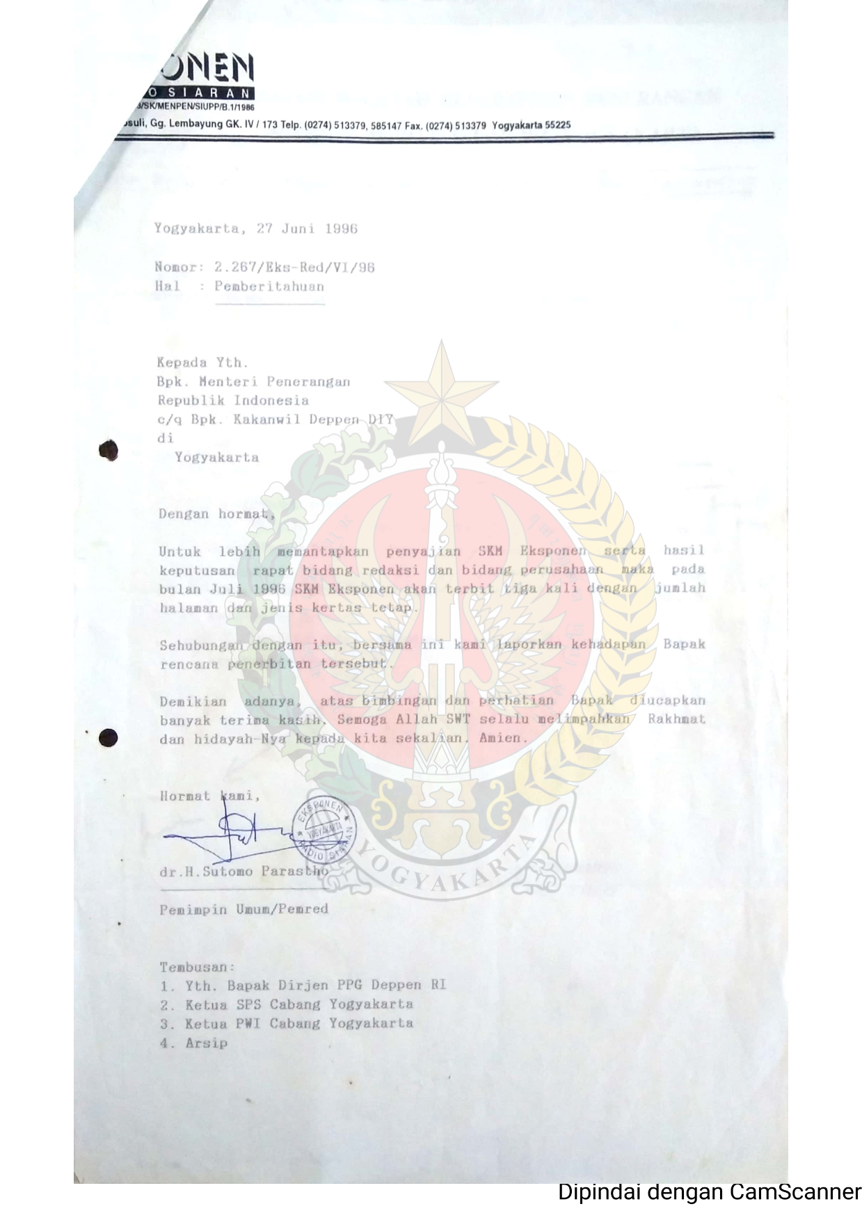 Surat dari Kepala Kantor Wilayah Departemen Peneranga Daerah Istimewa Yogyakarta kepada Pemimpin Surat Kabar Harian Yogya Post Yogyakarta perihal kewajiban kepada semua penerbit pers untuk mengirim nomor bukti penerbitannya 10 eksemplar setiap kali terbit dan menurut catatan administrasi nomor bukti sejak tanggal 7 Januari 1998 hanya 5 eksemplar.