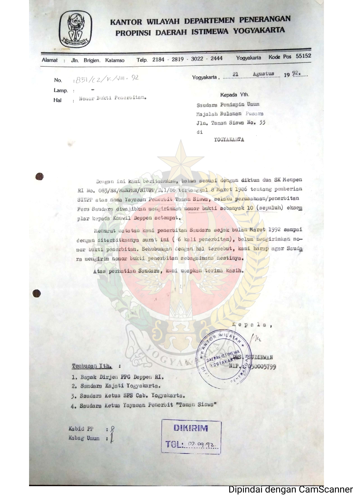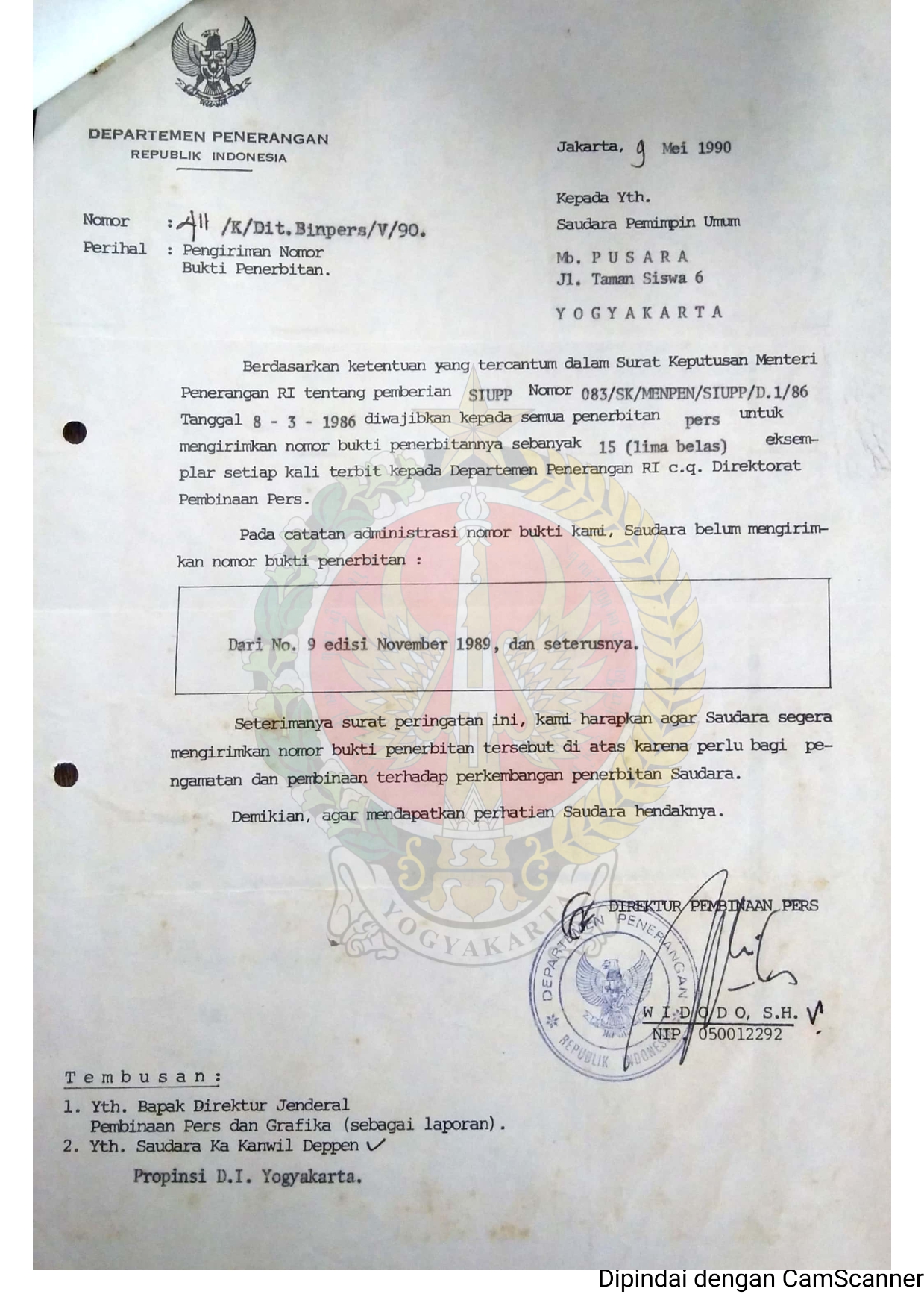 Surat dari Kepala Kantor Wilayah Departemen Penerangan Daerah Istimewa Yogyakarta kepada Pemimpin Umum Majalah Bulanan Pusara perihal belum mengirim Nomor Bukti Penerbitan dari Maret 1992 sampai diterbitkannya surat ini (6 kali penerbitan).