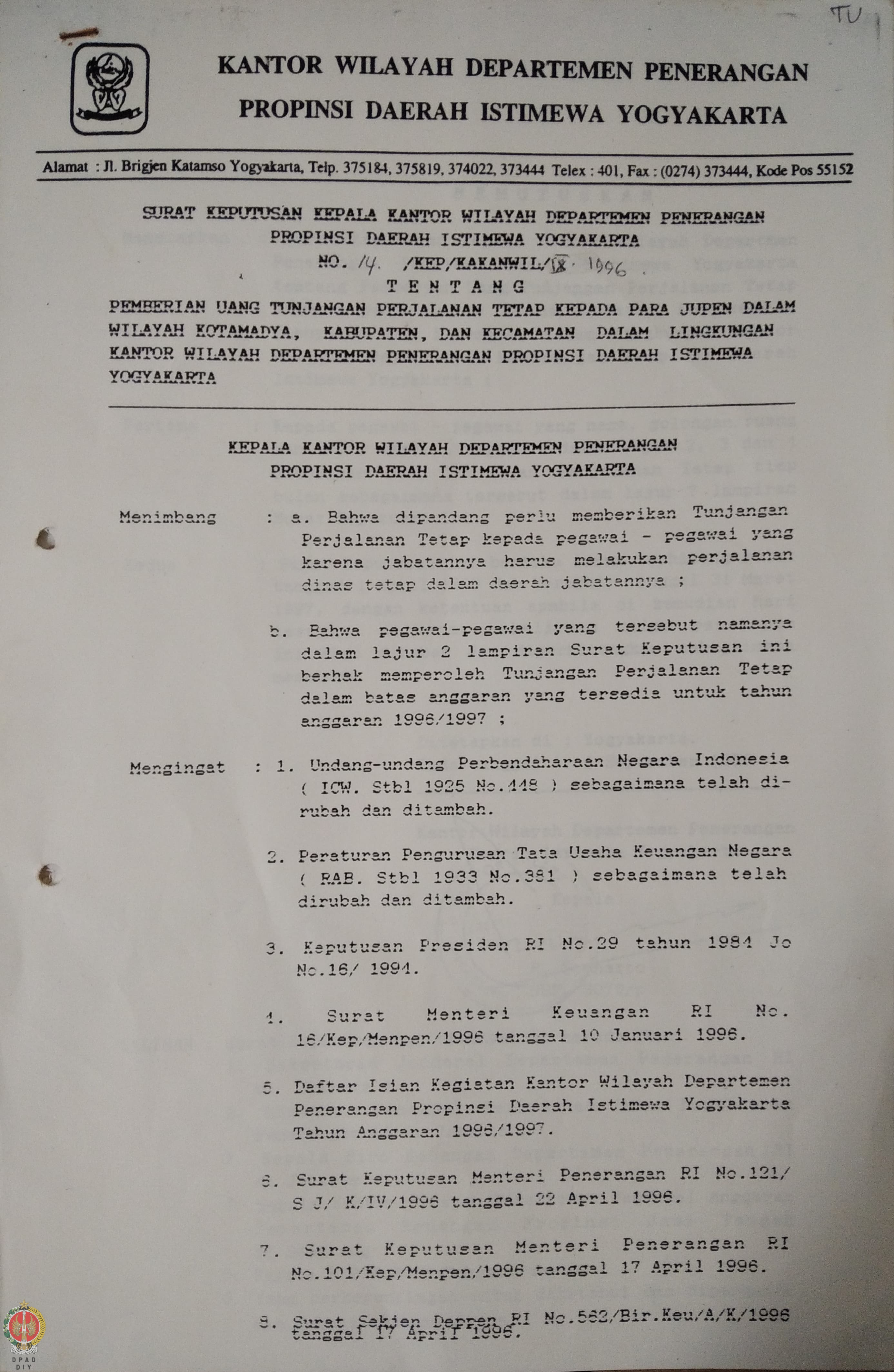 Surat Keputusan Kepala Kantor Wilayah Departemen Penerangan Daerah Istimewa Yogyakarta Nomor : 14/KEP/Kakanwil/IX.1996 tentang Pemberian Uang Tunjangan Perjalanan Tetap kepada para Jupen dalam Wilayah Kotamadya, Kabupaten dan Kecamatan dalam lingkungan Kantor Wilayah Departemen Penerangan Daerah Istimewa Yogyakarta, beserta lampiran