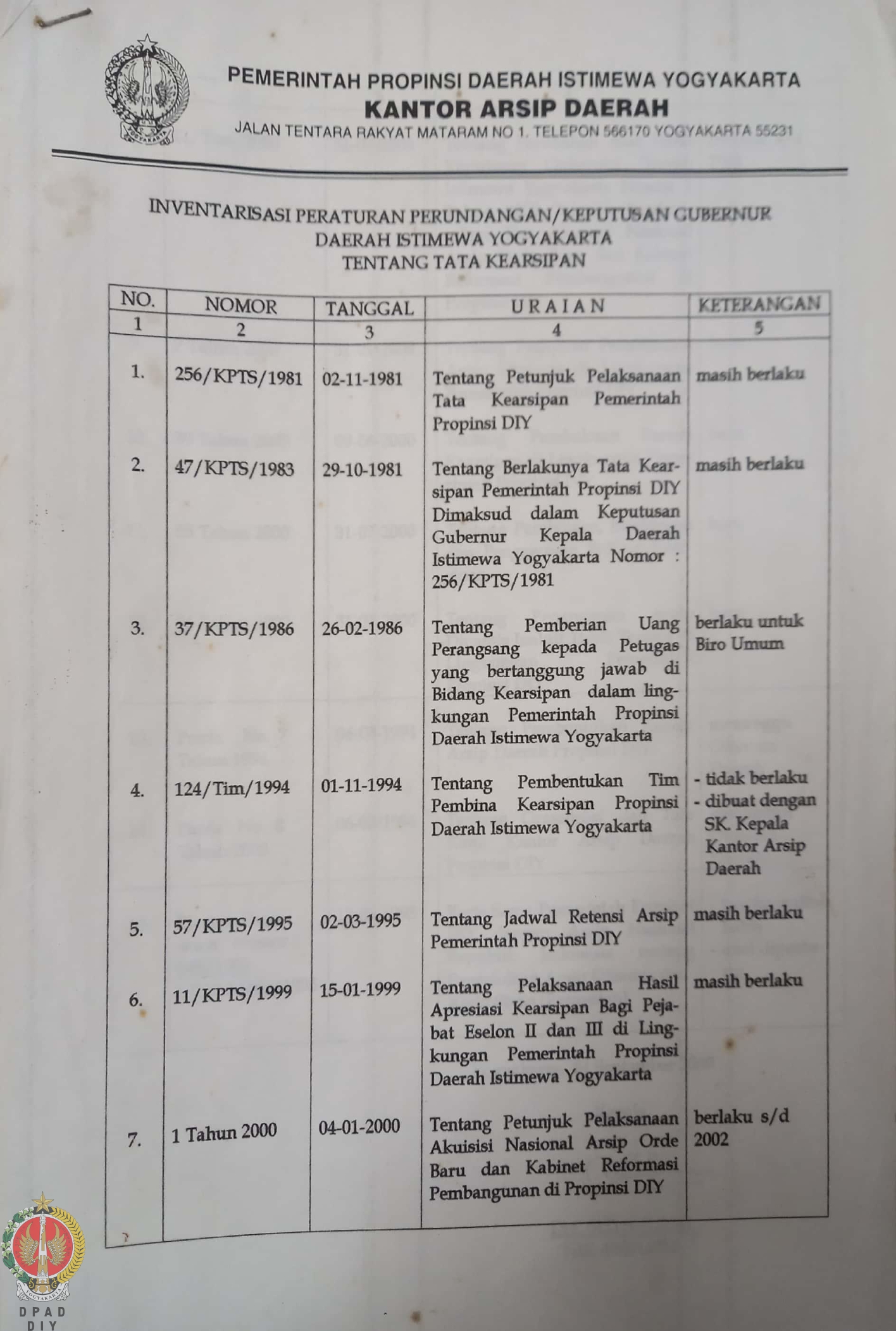 Daftar inventarisasi peraturan perundangan/keputusan Gubernur Daerah Istimewa Yogyakarta tentang tata kearsipan