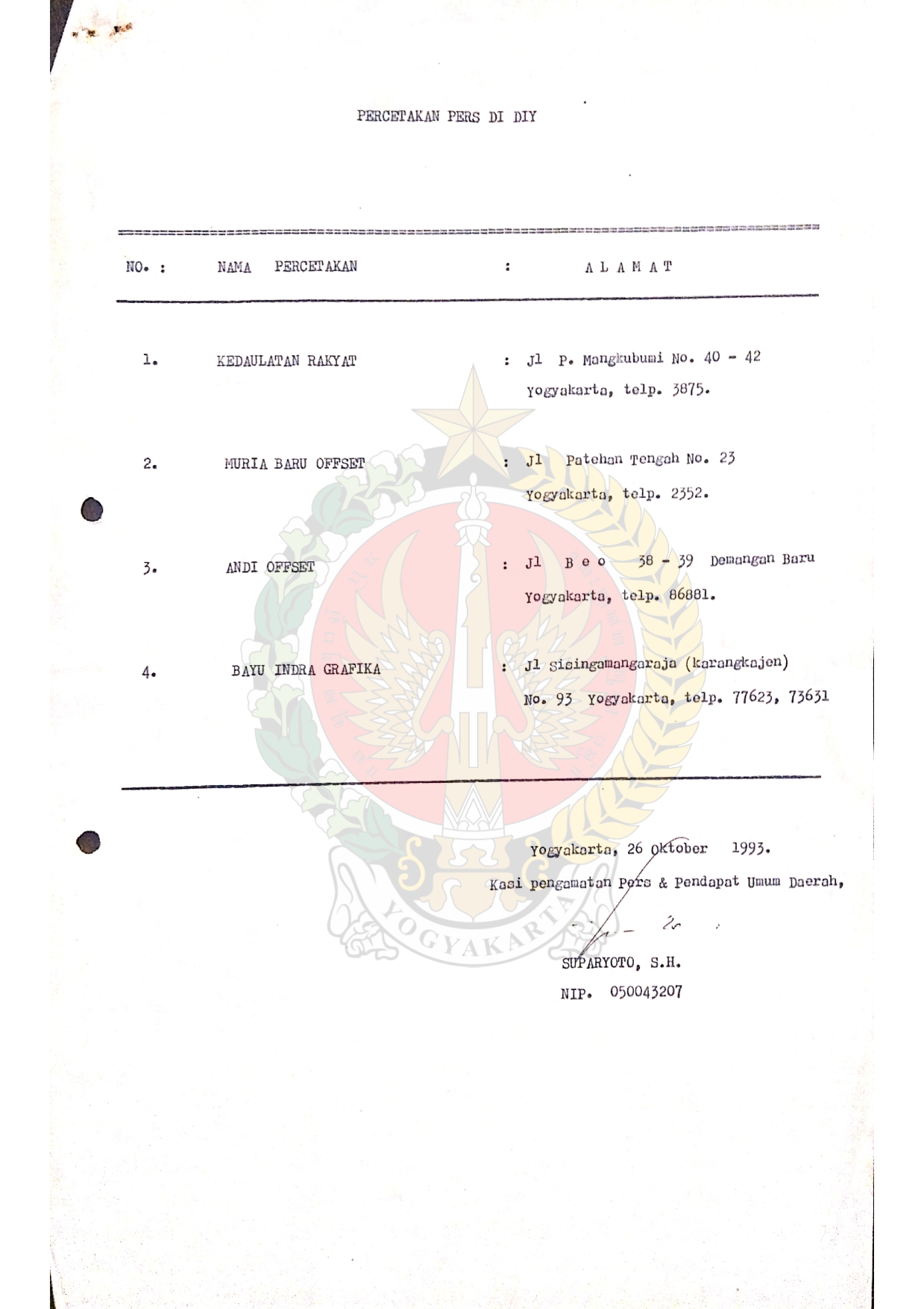 Daftar Percetakan Pers di Daerah Istimewa Yogyakarta dari/oleh Kepala Seksi Pengamatan Pers dan PUD