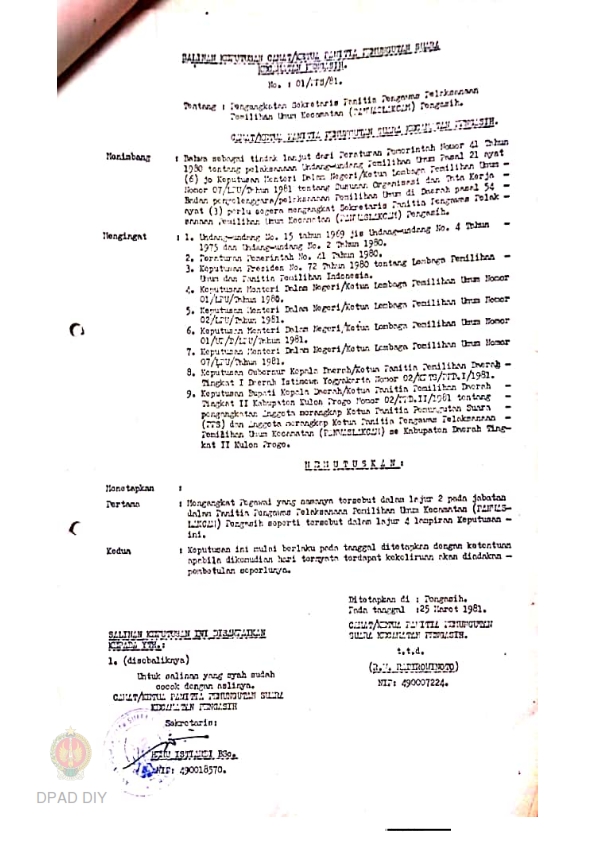 Daftar Susunan Organisasi PANWASLAKCAM Sekretaris dan Sekretariat PANWASLAKCAM PPS Kecamatan Pengasih No.18/PPD II/1981