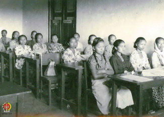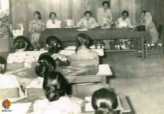 Ketua sementara Persatuan Istri Pegawai Penerangan Ny. Wirjo Probo sedang memberikan sambutan pada rapat yang pertama.