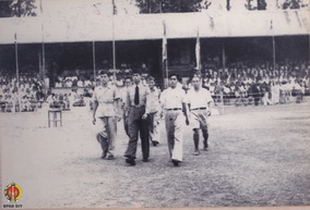 Panglima Besar Jenderal Soedirman beserta rombongan sesuai upacara berjalan meninggalkan lapangan sepak bola.
