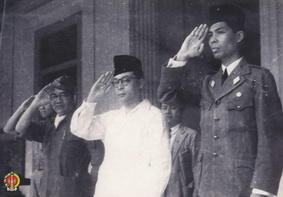 Panglima Besar Jenderal Soedirman didampingi Drs. Moh. Hatta sedang memberikan penghormatan balasan pada barisan parade yang melewati sekaligus memberikan penghormatan barisan.