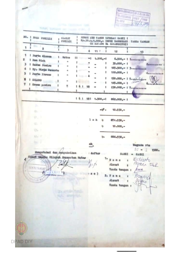Daftar lampiran surat pernyataan tertanggal 17 Maret 1988 tentang pernyataan pelepasan hak atas tanah, bangunan, tanah tumbuh yang berada di atasnya beserta pernyataan penerimaan uang ganti rugi bangunan dan karang kitri, Kalurahan Kedungsari, Kec. Pengasih, Kab. Kulonprogo