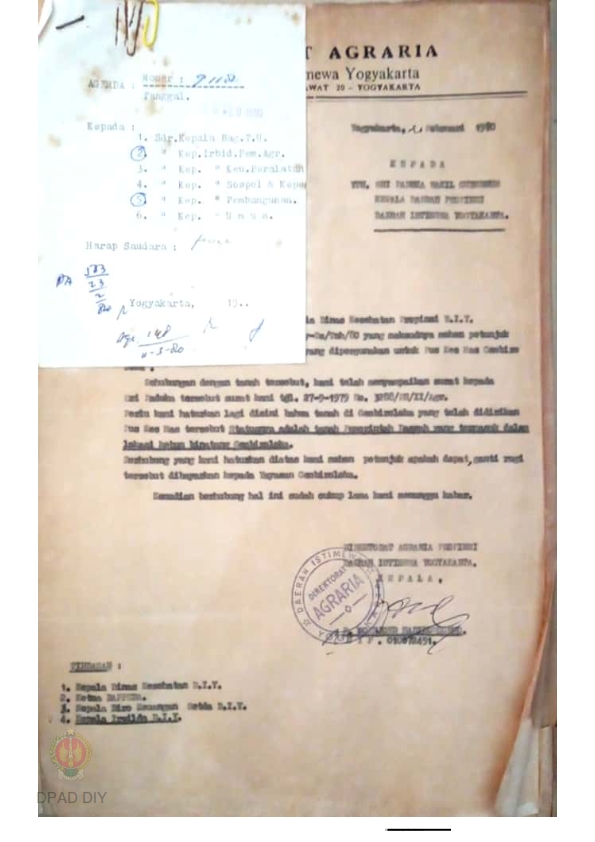 Surat Kepala Direktorat Agraria Prop. DIY kepada Sri Paduka Wakil Gubernur Kepala Daerah DIY tentang permohonan izin penjualan tanah kas desa Kal. Sinduadi, Kec. Mlati, Kab. Sleman.