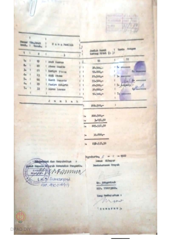 Daftar lampiran surat pernyataan tertanggal 8 Pebruari 1988 tentang pernyataan pelepasan hak atas tanah, bangunan, tanah tumbuh yang berada di atasnya beserta pernyataan penerimaan uang ganti rugi bangunan dan karang kitri, Kalurahan Kedungsari, Kec. Pengasih, Kab. Kulonprogo
