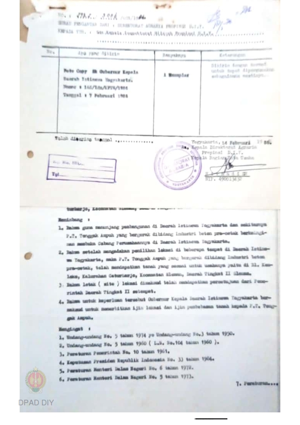 Surat Keputusan Gubernur Kepala Daerah DIY No. 165/Idz/KPTS/1986 tanggal 7 Pebruari 1986 tentang Pemberian izin lokasi dan ijin pembebasan tanah kepada PT. TONGGAK AMPUH untuk membebaskan tanah milik penduduk yang terletak di Bl. Kemloko, Kal. Caturharjo, Kec. Sleman, Daerah Tk. II Sleman seluas 10085 m2 yang akan dipergunakan untuk mendirikan pabrik beton pra cetak.