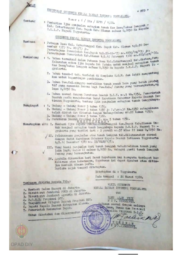 Surat Keputusan Gubernur Kepala Daerah DIY No. 6/Idz/KPTS/1980 tanggal 24 Maret 1980 dan No. 16/Idz/KPTS/1980 tanggal 16 Desember 1980 tentang pemberian izin penjualan sebagian tanah kas desa Kal. Caturtunggal Kec. Depok Kab. Sleman.