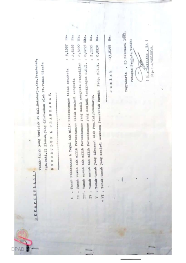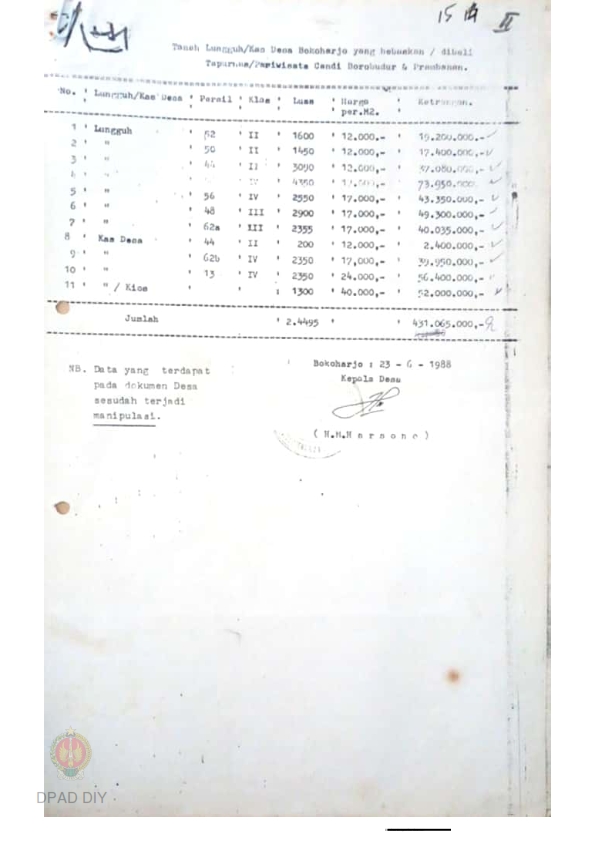 Tanah lungguh/ kas desa Bokoharjo yang dibebaskan/ dibeli Taparnas/ Pariwisata Candi Borobudur dan Prambanan dari Kepala Desa Bokoharjo.
