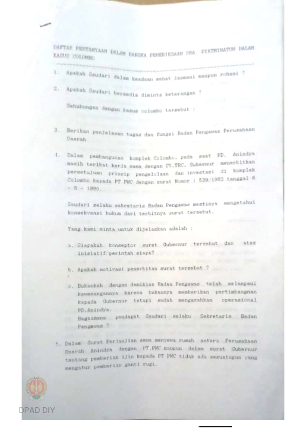 Surat dari Sekretariat Wakil Presiden RI nomor R-5668/wk.Pres/Was/P/09/1997 kepada Gubernur Kepala Daerah DIY perihal penyimpangan oknum pejabat di lingkungan Kantor Pemda Prop. DIY berdasarkan pengaduan masyarakat melalui Tromol pos 5000.