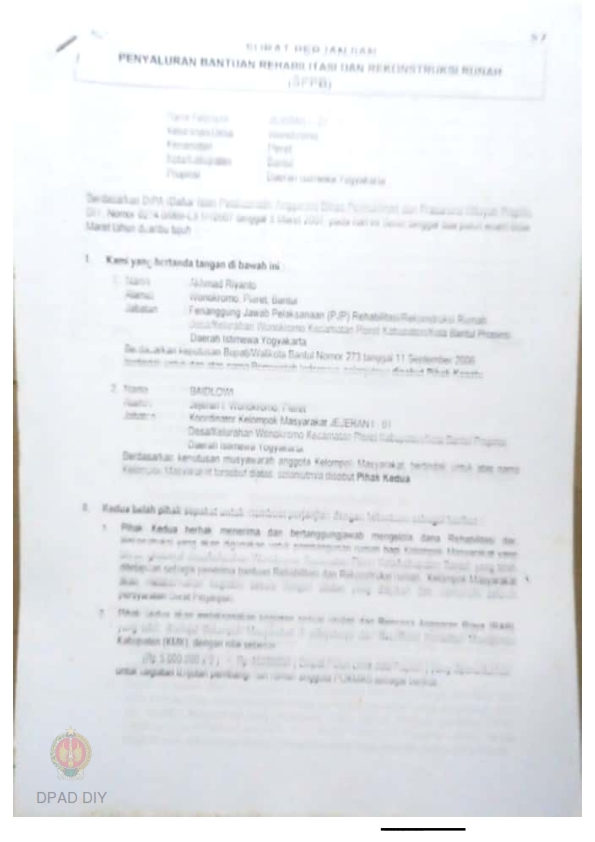 Surat Perjanjian Penyaluran Bantuan Rehabilitasi dan Rekonstruksi Rumah (SPPB), Nama Kelompok Masyarakat Karanganom, Kel/Desa Wonokromo, Kecamatan Pleret, Kabupaten Bantul, Propinsi Daerah Istimewa Yogyakarta. |
