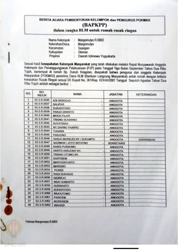 Checklist Kelengkapan Dokumen untuk Pencairan Dana Rehabilitasi dan Rekonstruksi Rumah Rusak Ringan Nama Kelompok Margomulyo 002, Kel/Desa Margomulyo, Kecamatan Sayegan, Kabupaten Sleman, Propinsi Daerah Istimewa Yogyakarta.