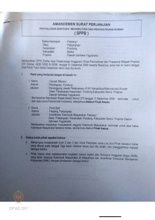 Amandemen Surat Perjanjian Penyaluran Bantuan Rehabilitasi dan Rekonstruksi Rumah (SPPB), Nama Kelompok Badan I s.d. XV, Kel/Desa Panjangrejo, Kecamatan Pundong, Kabupaten Bantul, Propinsi Daerah Istimewa Yogyakarta |