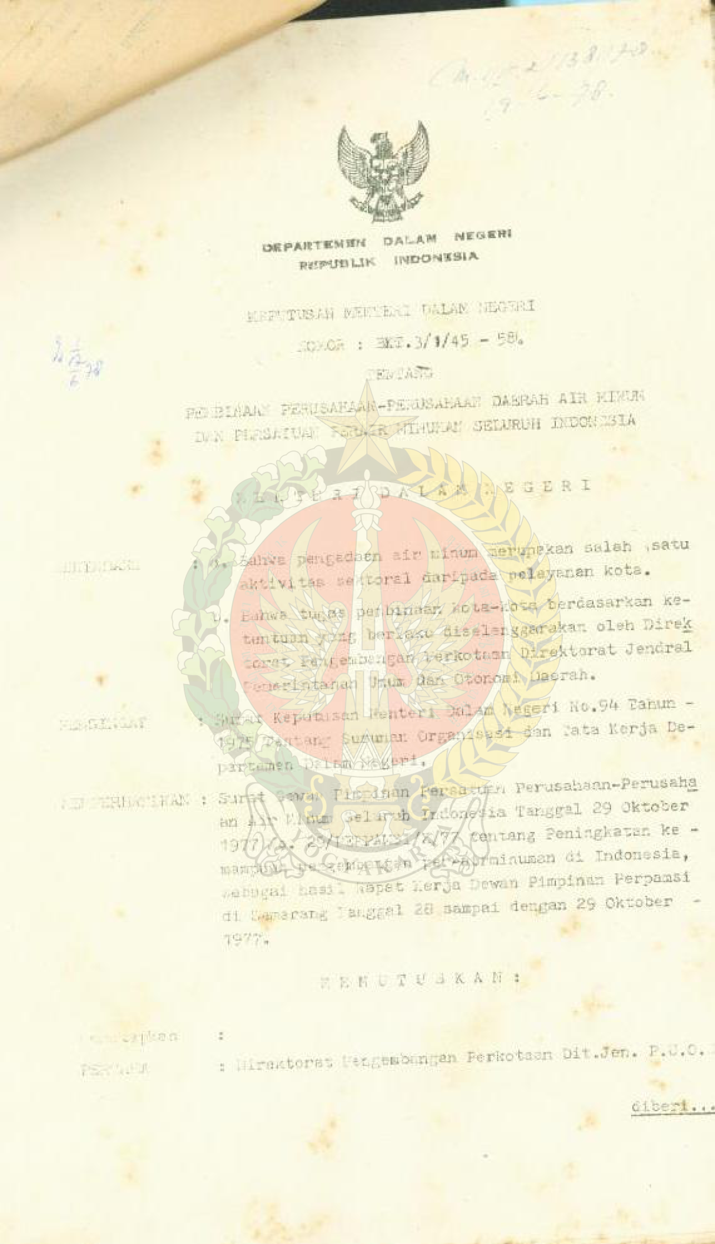 Kep. Mendagri No BKT 3/I/45/1978 tentang pembinaan perusahaan-perusahaan daerah air minum dan perusahaan perairminuman Indonesia.
