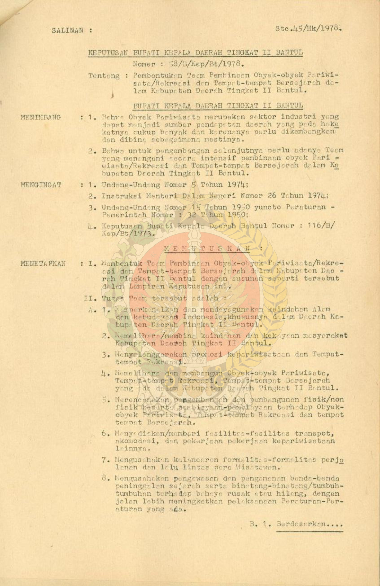 Keputusan Bupati KDH TK II Bantul No 58/B/Kep/Bt/1978 tentang pembentukan team pembinaan obyek-obyek pariwisata/rekreasi dan tempat bersejarah dalam Kab. Dati II Bantul.