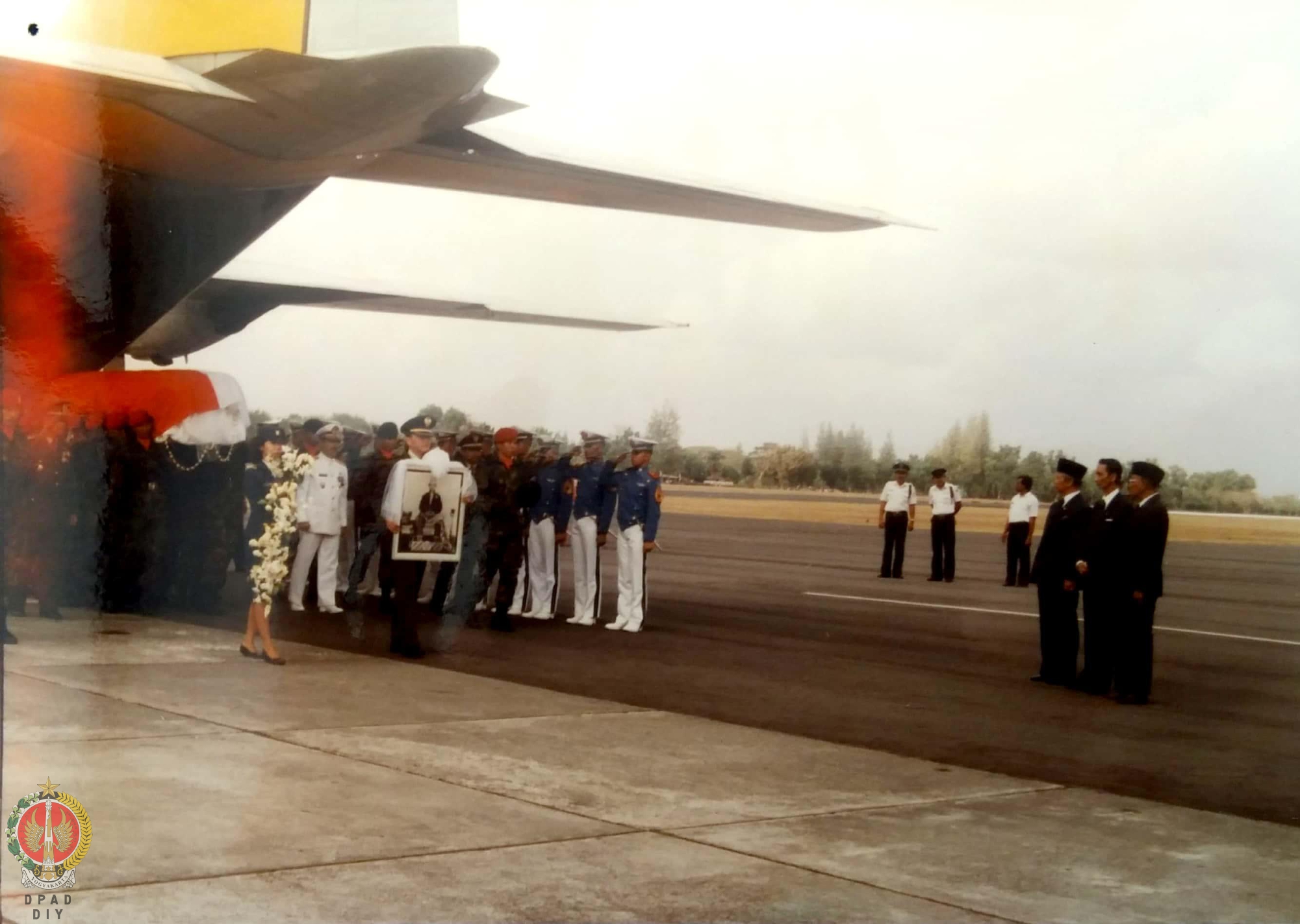 Keranda jenasah HB IX diturunkan dari pesawat TNI AU (Hercules ) disambut Paku Alam VIII, ketua MA Ali Said SH, dan Menko Kesra Soeparjo Rustam