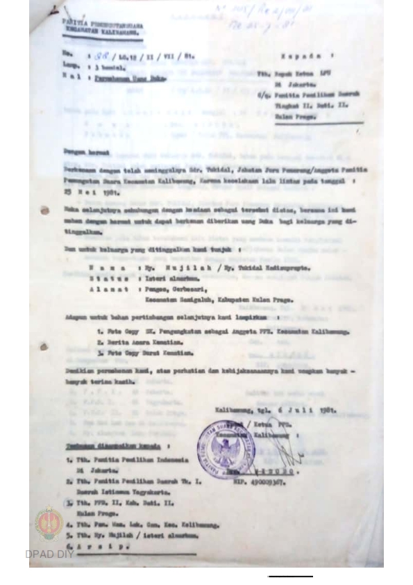 Surat dari Camat/ Ketua PPS Kecamatan Kalibawang No: 88/LC.12/II/VII/81 kepada Ketua LPU c/q Panitia Pemilihan Daerah Dati II Kulon Progo perihal permohonan uang dua atas nama sdr. Tukidal, Juru Penerang / anggota Panitia Pemungutan Suara Kecamatan Kalibawang.
