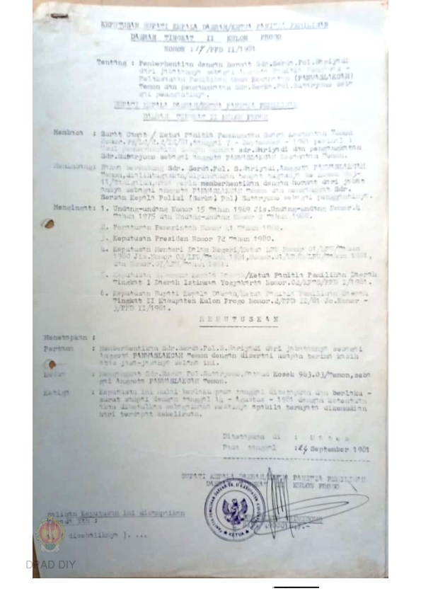 Keputusan Bupati Kepala Daerah/ Ketua Panitia Pemilihan Daerah Tingkat II Kulon Progo nomor: 17/PPD II/1981 tentang pemberhentian dengan hormat Sdr. Serda Pol. Hariyadi dari jabatannya sebagai Anggota Panitia Pengawas Pelaksanaan Pemilihan Umum Kecamatan (PANWASLAKCAM) Temon dan pengangkatan Sdr. Serka Pol Sutaryono sebagai penggantinya.