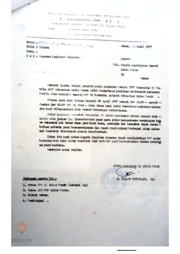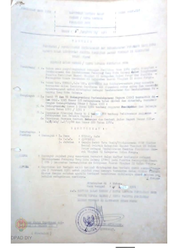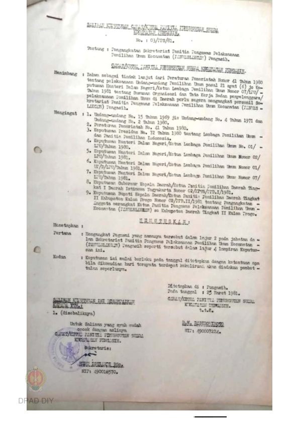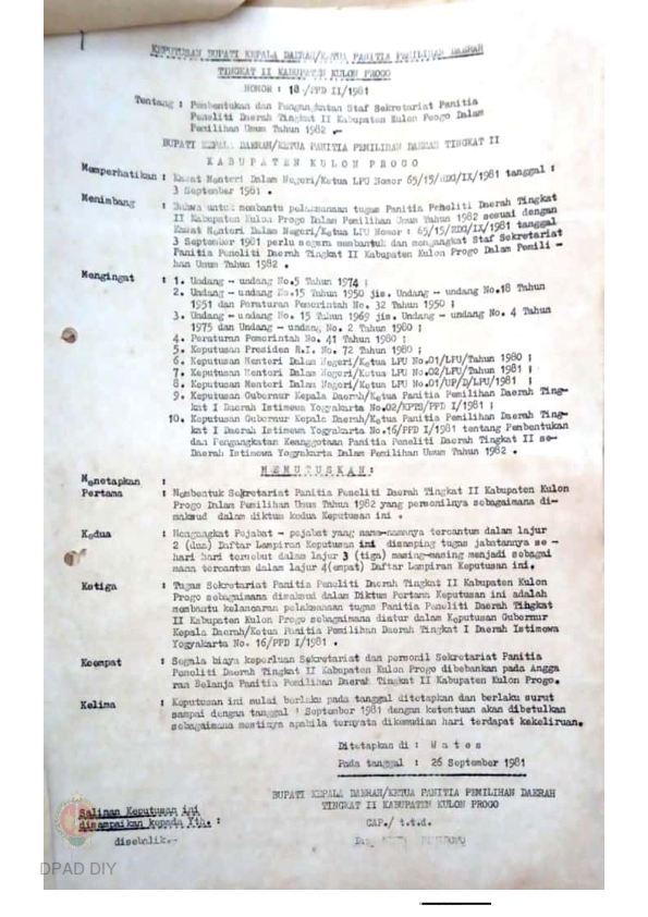 Keputusan Bupati Kepala Daerah/ Ketua Panitia Pemilihan Daerah Tingkat II Kabupaten Kulon Progo No. 3/PPDII/1981 tentang Pengangkatan Anggota merangkap wakil Ketua, Sekretaris PPS dan anggota merangkap wakil Ketua Panwaslakcam se-Kabupaten Kulon Progo.