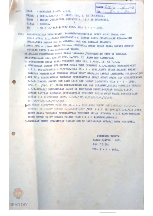 Telegram dari Mendagri/Ketua LPU untuk Gubernur KDH TKI/ Ketua PPD I se-Indonesia nomor: 57/ 15/ R.D.G/IV/1982 tanggal 2 April 1982 perihal permintaan tambahan / penggantian surat-surat suara dari PPD I / PPD II.