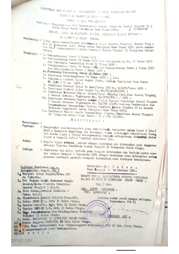 Keputusan Bupati Kepala Daerah / Ketua Panitia Pemilihan Daerah Tingkat II Kab. Kulon Progo No. 23 / PPD II/1981 tentang Pengangkatan Staf Sekretariat Panitia Peneliti Daerah Tk. II Kab. Kulon Progo Dalam Pemilihan Umum Th. 1982.