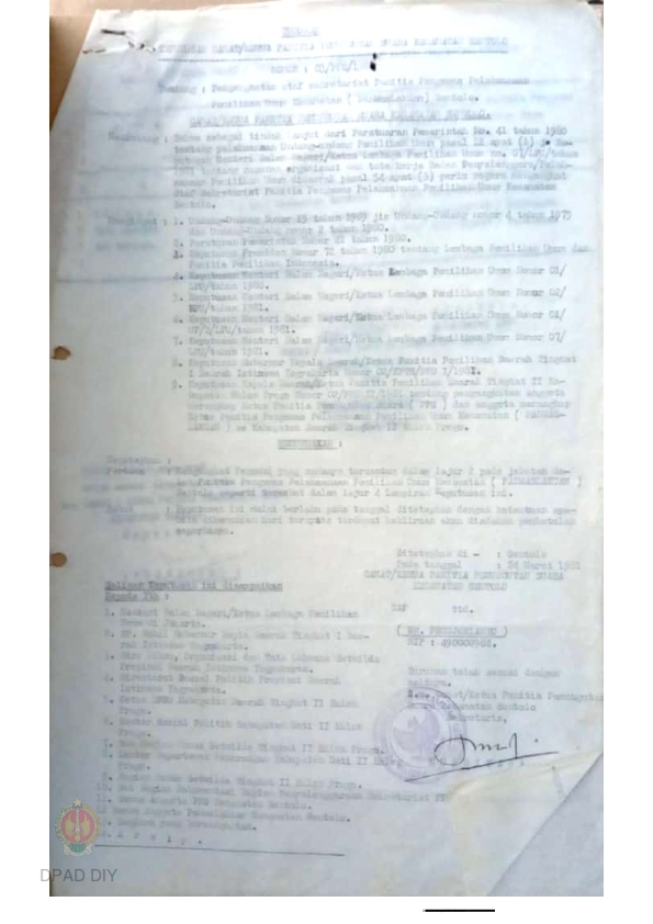 Surat Panitia Pemilihan Daerah Tingkat I DIY No.452/ LI/ VIII/ 1982 kepada Bupati Kepala Daerah/ Ketua PPD Tk II Kabupaten Kulon Progo tentang Petunjuk Pembubaran PPS dan Panwaslakcam termasuk sekretariatnya.
