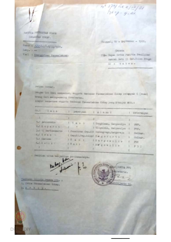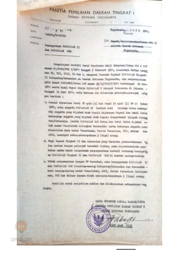 Surat PPD Tk I, DIY No. 89/L2/VI/1981 kepada Bupati/Walikotamadya/Ketua PPD II se-DIY tentang keanggotaan Panwaslak II dan Panwaslakcam.