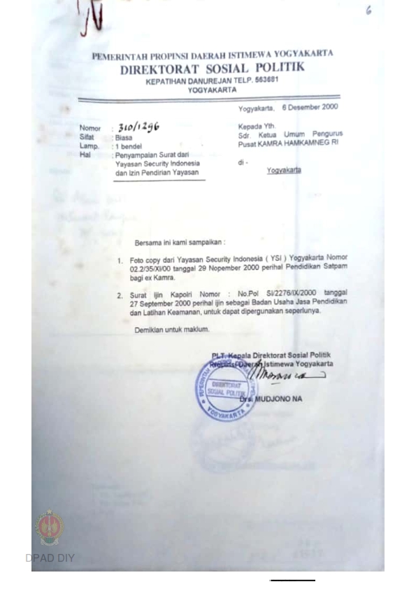 Surat dari PH. Kepala Direktorat Sosial Politik Provinsi DIY kepada Ketua Umum Pengurus Pusat Kamra Hamkamnas neg. RI di Yogyakarta nomor310/1296 perihal penyampaian surat dari Yayasan Security Indonesia dan Izin Pendirian Yayasan.