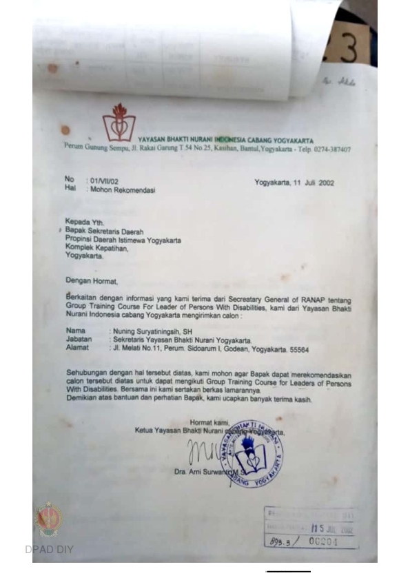 Surat dari Ketua Yayasan Bhakti Nurani Indonesia cabang Yogyakarta kepada Sekda Provinsi DIY Nomor 01/VII/02 perihal permohonan rekomendasi untuk mengikuti training course for Leader Of Persons With Disabilities.