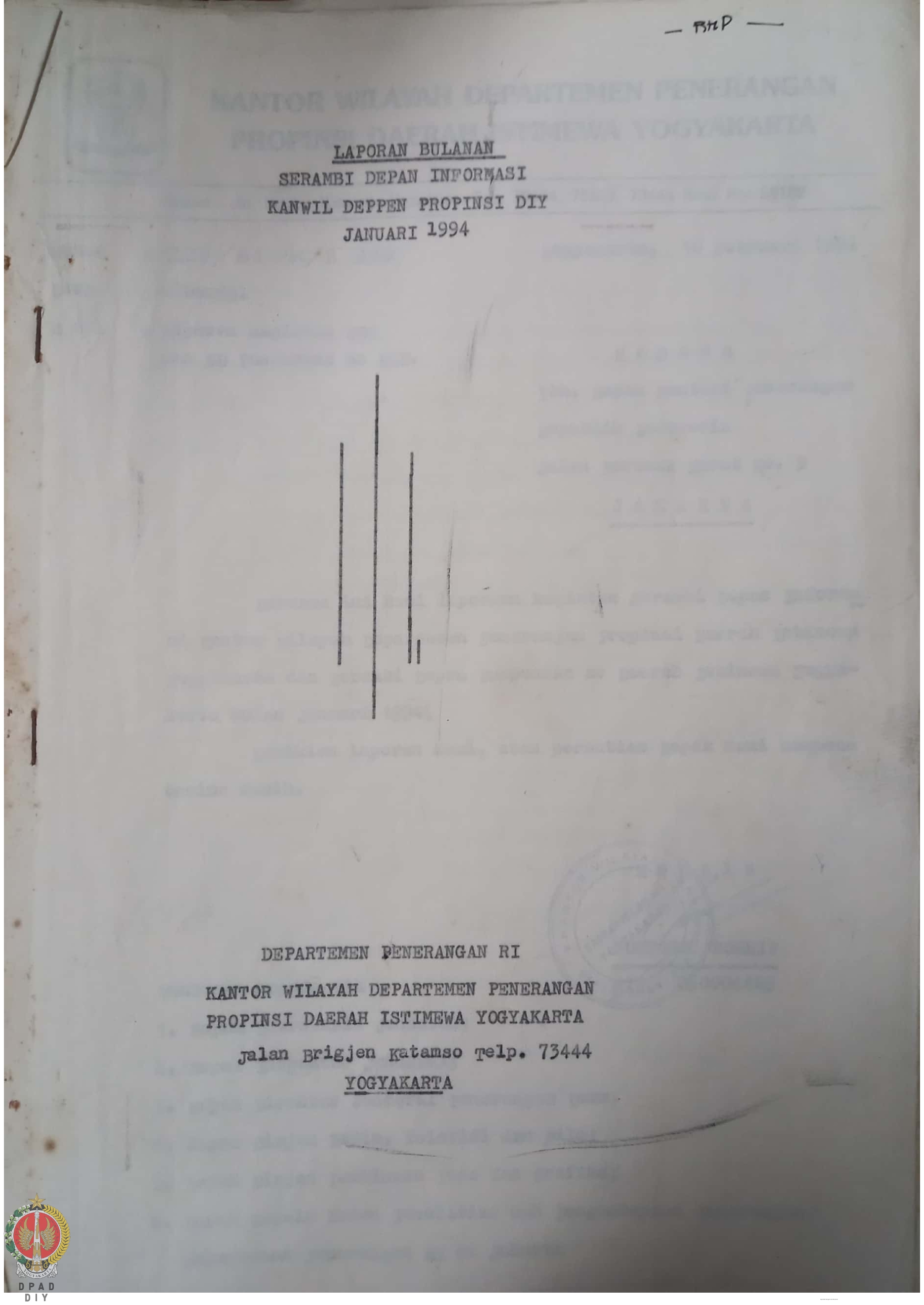 Laporan Bulanan Serambi Depan Informasi Kantor Wilayah Departemen Penerangan Provinsi Daerah Istimewa Yogyakarta bulan Januari, Maret, April, Mei, Juni, Juli, Agustus, September, Oktober, November, Desember tahun 1994 Departemen Penerangan Republik Indonesia Kantor Wilayah Departemen Penerangan Daerah Istimewa Yogyakarta.