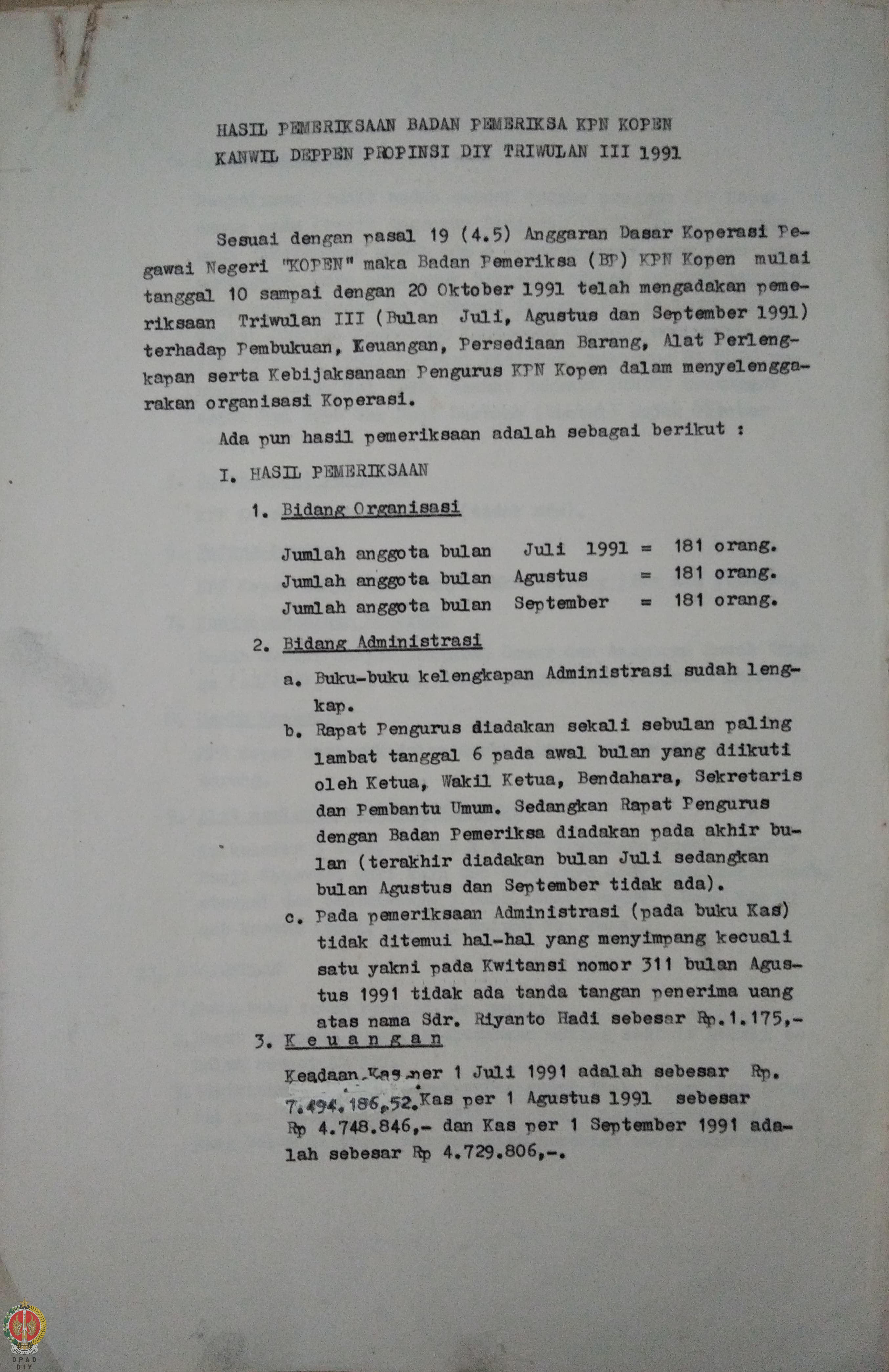 Hasil Pemeriksaan Badan Pemeriksa Kantor Perbendaharaan Negara (KPN) “KOPEN” (Koperasi Pegawai Negeri) Kantor Wilayah Departemen Penerangan Provinsi Daerah Istimewa Yogyakarta Triwulan II 1991.