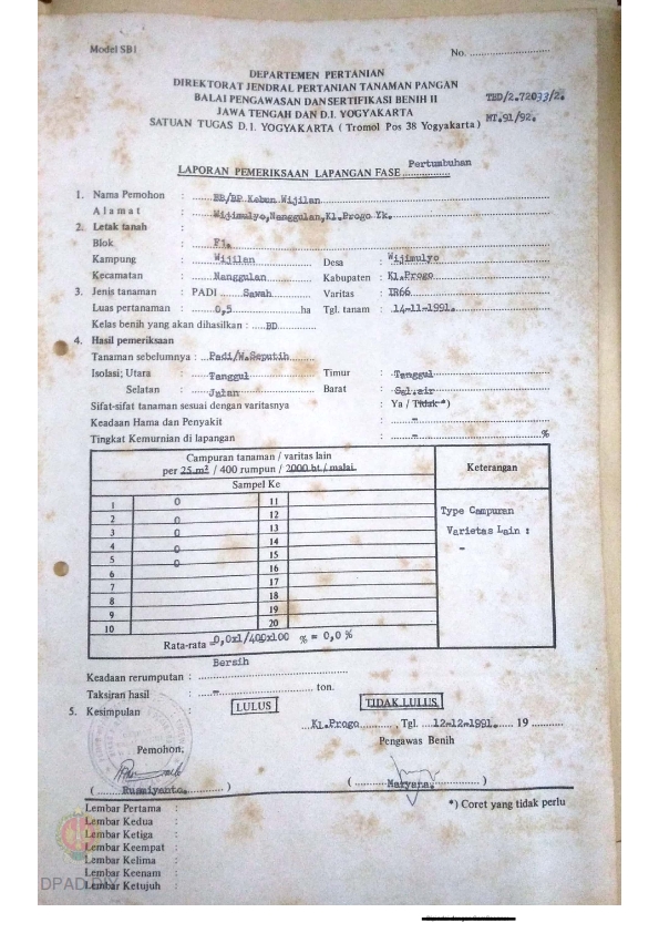 Laporan dari Balai Pengawasan dan Sertifikasi Benih II Jawa Tengah dan DIY, Satuan Tugas DIY tentang hasil pemeriksaan lapangan fase pertumbuhan, benih padi varietas IR 66 di BBI Wijilan, bulan Desember 1991.