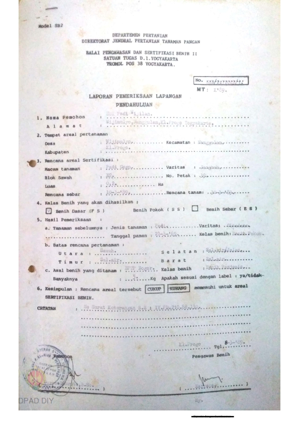 Laporan dari Balai Pengawasan dan Sertifikasi Benih II Satuan Tugas DIY tentang Hasil Pemeriksaan Lapangan Pendahuluan untuk Sertifikasi Bibit Varietas Jangkah di BBI Padi Wijilan.