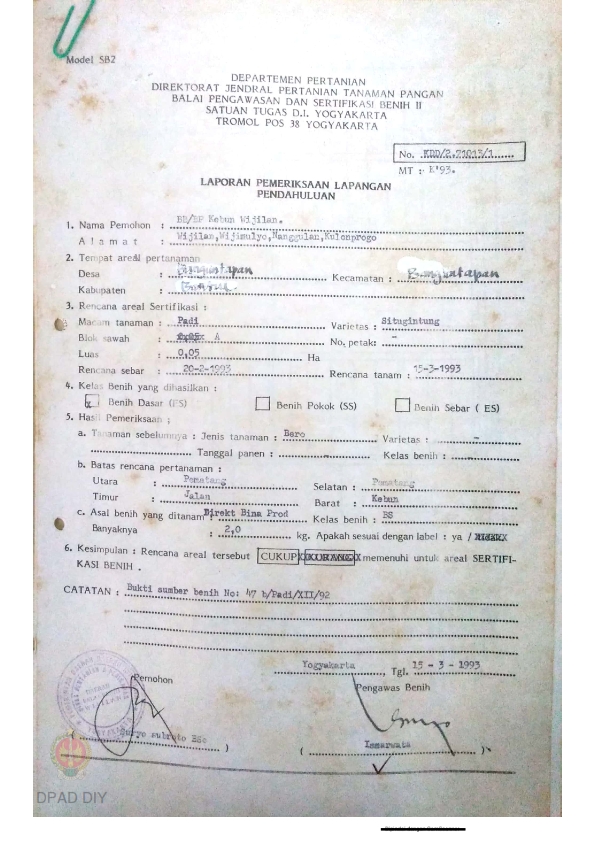 Laporan dari Balai Pengawasan dan Sertifikasi Benih II Satuan Tugas DIY tentang Hasil Pemeriksaan Lapangan Pendahuluan, Varietas Situgintung, bulan Maret 1993.