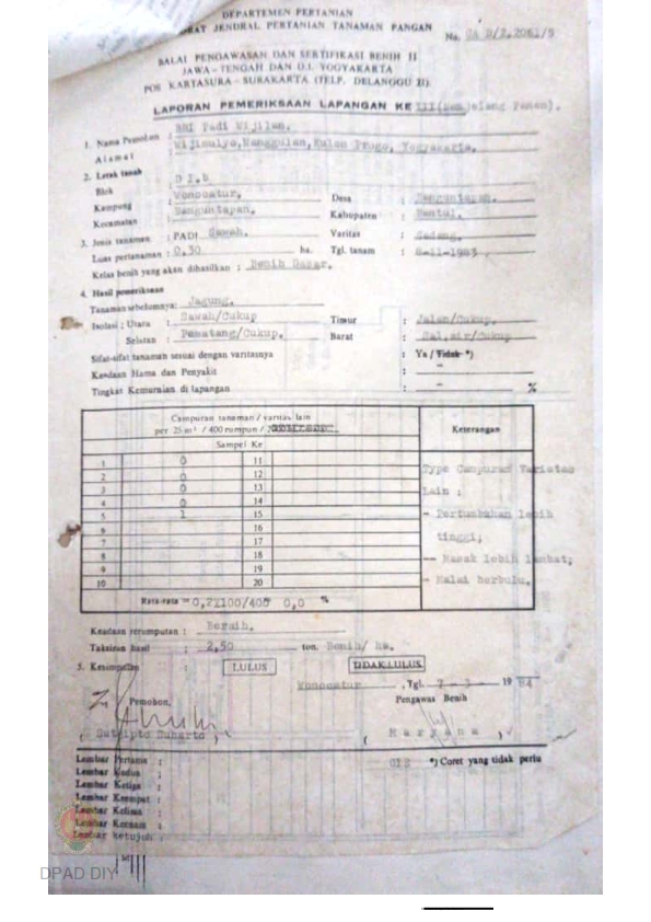 Laporan dari Balai Pengawasan dan Sertifikasi Benih II tentang hasil pemeriksaan lapangan ke III (Menjelang Panen), benih Varitas Sadang di Balai Benih Induk padi Wijilan, Wijimulyo, Nanggulan, Kulonprogo