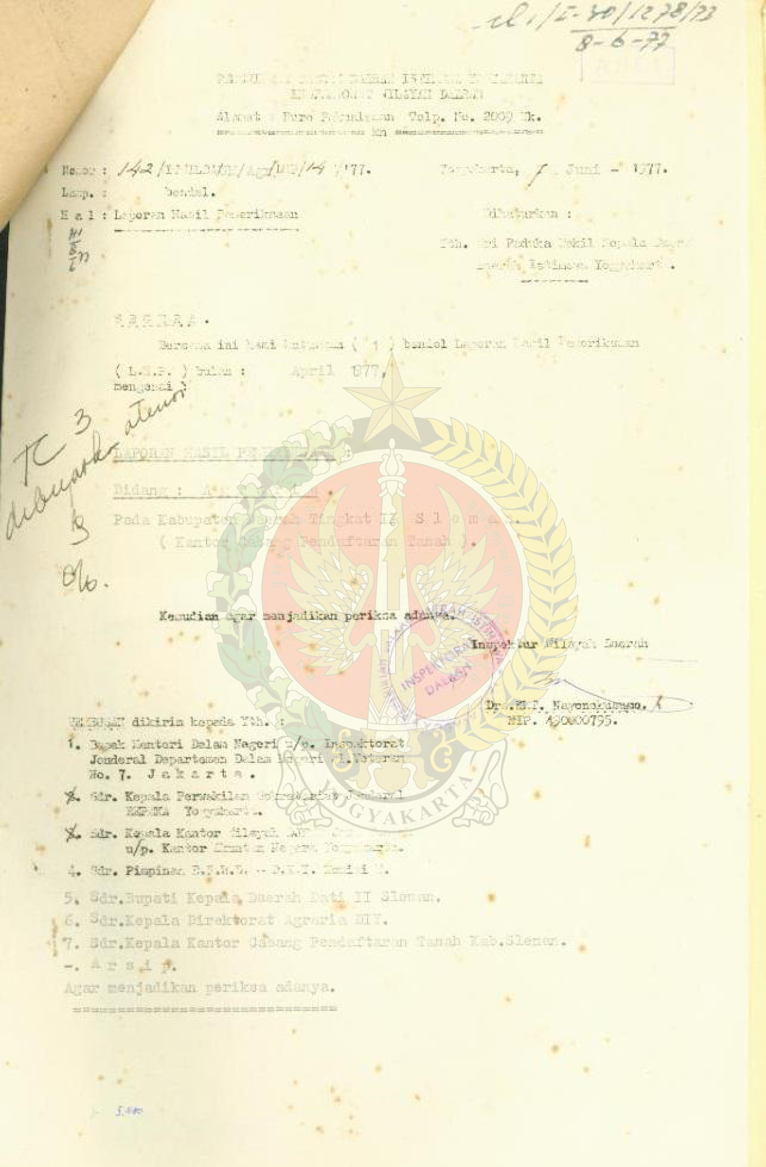 Laporan hasil pemeriksaan bidang agraria bulan April 1977 Kantor Cabang Pendaftaran tanah Kab. Sleman.