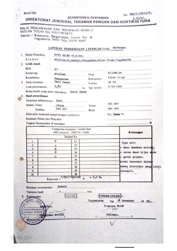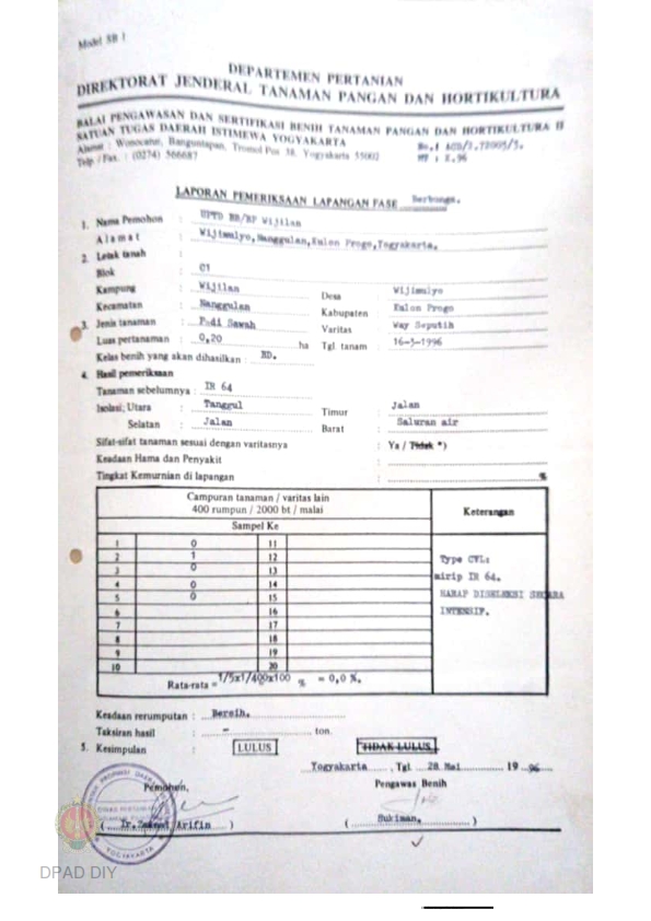Laporan Hasil pemeriksaan lapangan fase berbunga BPSB II Jateng dan DIY jenis tanaman padi Varitas Way Seputih bulan Mei 1996 di desa Wijimulyo