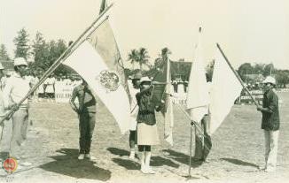 Pembacaan janji atlit yang dibacakan oleh seorang atlit dan dikelilingi bendera-bendera kontingen