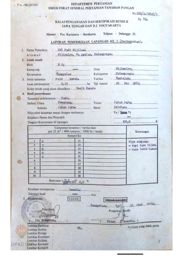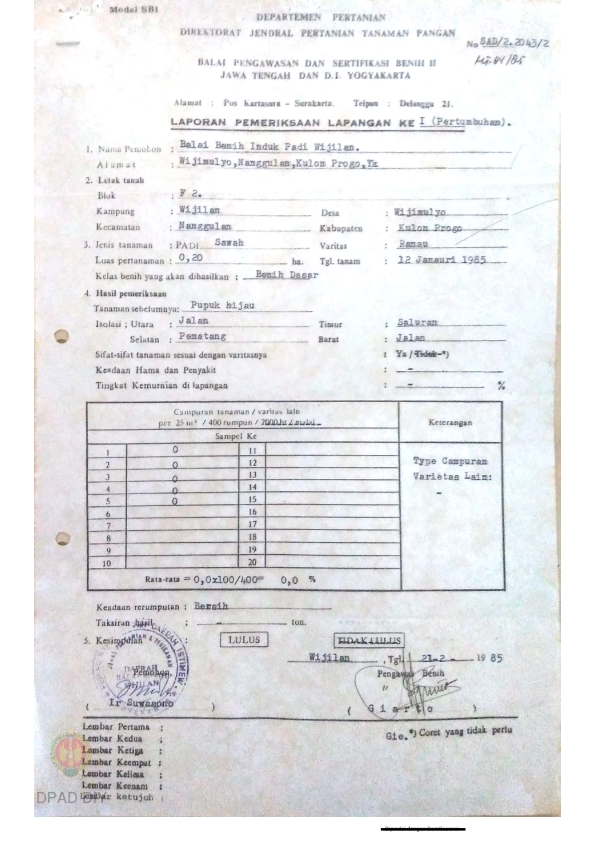Laporan dari Balai Pengawasan dan Sertifikasi Benih II Jawa Tengah dan DIY tentang laporan pemeriksaan lapangan ke I pertumbuhan benih varitas Ranau di Balai Benih Induk Padi Wijilan, bulan Pebruari 1985.