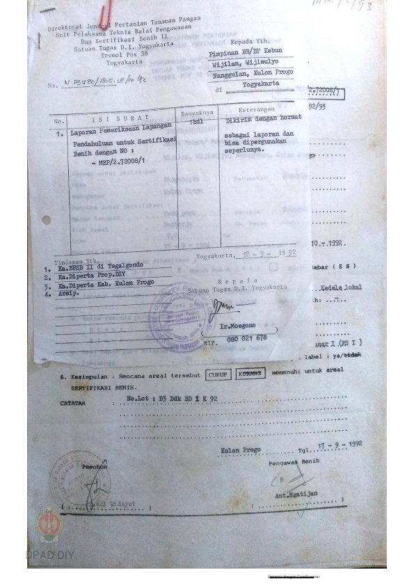 Laporan dari Balai Pengawasan dan Sertifikasi Benih II Satuan Tugas DIY tentang Hasil Pemeriksaan Lapangan Pendahuluan untuk Sertifikasi Bibit Varietas Dodokan di BB/BP Kebun Wijilan.