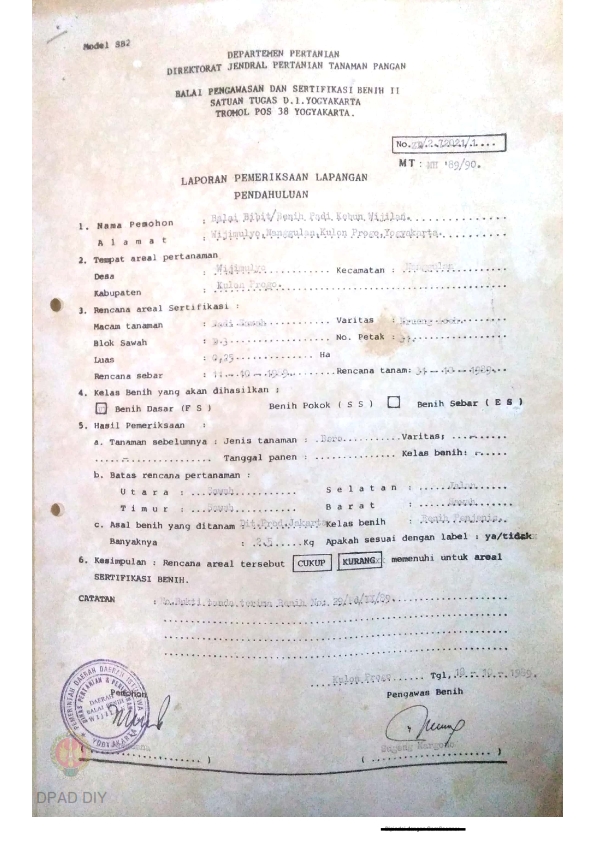 Laporan dari Balai Pengawasan dan Sertifikasi Benih II Satuan Tugas DIY tentang Hasil Pemeriksaan Lapangan Pendahuluan untuk Sertifikasi Bibit Varietas Bengawan Solo di BB/BP Kebun Wijilan.